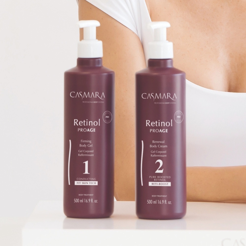 Casmara's Retinol ProAge Body System is a two-step firming anti-aging body treatment with Pure Retinol, Fit Skin Tech and Exosomes, specially designed for beauty professionals who want to offer their clients visible and effective results in body skin care.